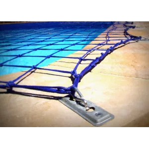 The mesh net is made of strong UV stabilised nylon cord with an 8cm mesh size and is retained by anchor hooks around the pool edge. This simple arrangement is suitable for all pool shapes and provides for easy fixing and removal. Included in the installation kit are floats and a central tensioning system that maintains the net suspension from the water